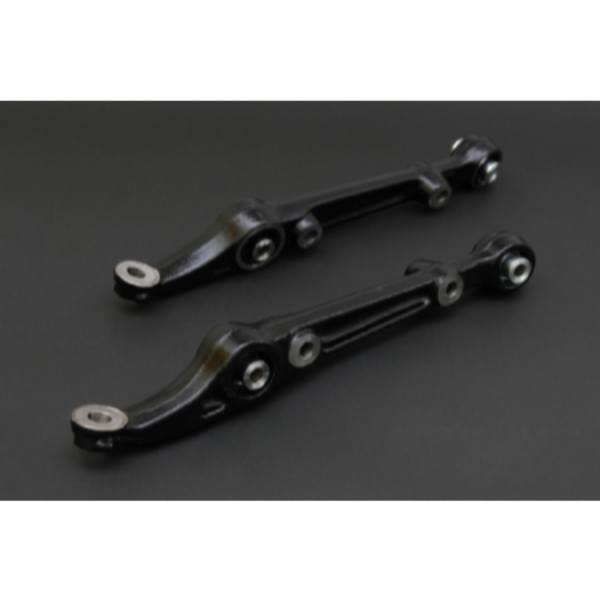 Control arm made with hardened steel and compound with hard rubber bushing or pillow ball bushing. A good control arm can regulate the movement of wheels quickly each time you turn or corner.