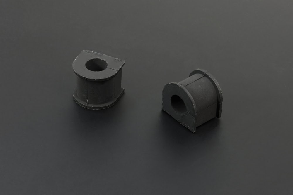 Hardrace reinforced stabilizer bushings are made of exclusive thermoplastic material for increased strength and hardness, oil/alkali/ozone resistant properties and self-lubricated function. Unlike ordinary NBR that tends to break easily or polyurethane that often causes squeaks and harsh rides, these bushings can achieve a perfect balance between the two, offering superior suspension response and durability while maintaining great ride quality.