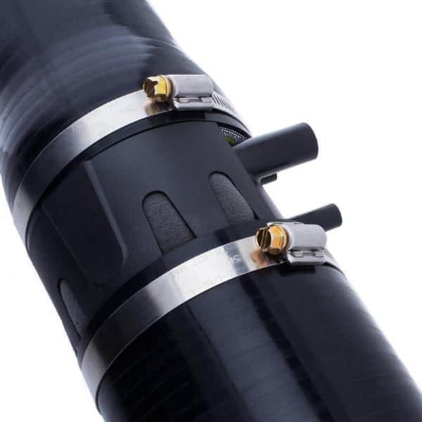 One very cool component in this kit is the injection molded air bypass manifold. This manifold serves a number of functions. It provides attachment points for the factory MAF as well as for the (included) silicone tubing that attaches to the factory valve cover vent and air bypass valve. It also has a built-in air bypass feature that allows air into the engine when the intake’s filter becomes wet. This helps to avoid the dreaded hydro-lock that so many people normally worry about in heavy rain. We tested the bypass valve by totally submerging an air filter in a bucket of water and running the motor. Even when totally submerged, the engine idled and rev’d safely without hydro-locking. Of course, we still advise practicing caution when going through deep water in any car!