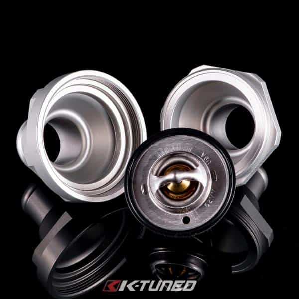 This part is most often used in conjunction with our K-Tuned Water Pump Block Off Plate kit. Installation of the Water Plate kit deletes the factory T-stat housing so if you need or want to have a T-stat in your cooling system you’ll need to use this part for sure. This billet thermostat housing is designed to splice the thermostat into the lower hose of your K-series cooling system. Fits standard 1.25′ rad hoses and comes complete with a new 180 deg Stant T-stat. Machined billet aluminum finish only.