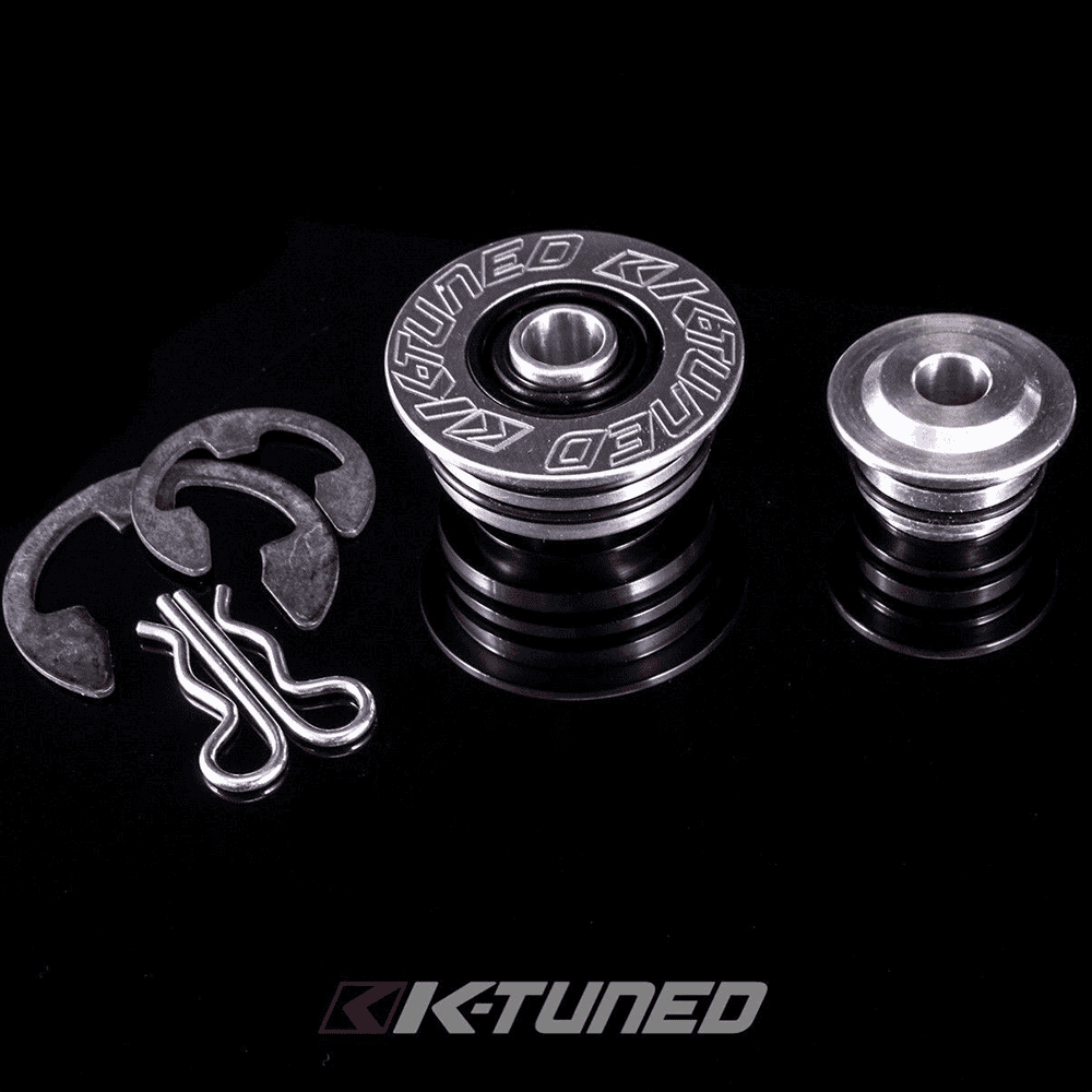 K-Tuned Shifter Cable Bushings are a simple and easy to install upgrade that improves shift feel and accuracy. These bushings are installed on both transmission side connections of the cables and are made with solid 6061 billet aluminum and feature a spherical bearing on the larger front-back cable.