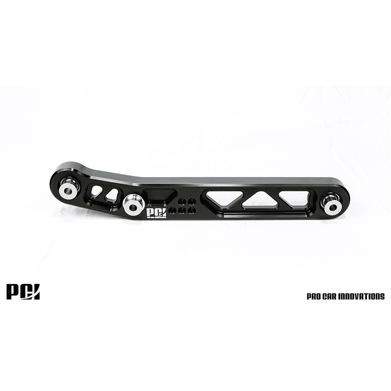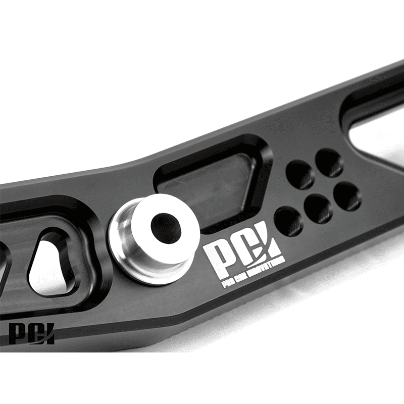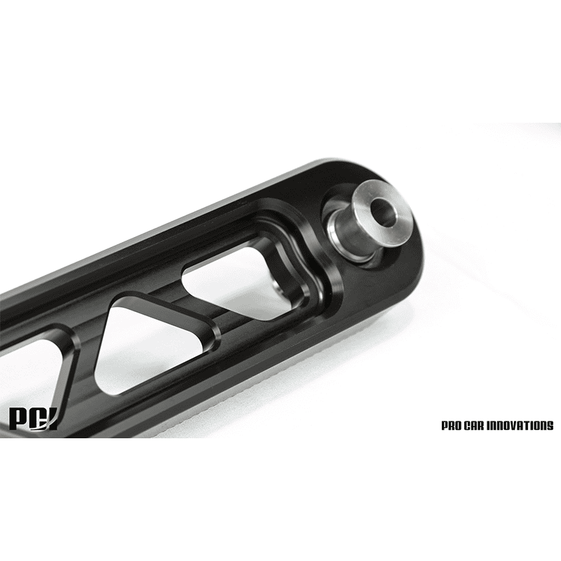 Replacing the factory rubber bushing rear lower control arm with the Pro Car Innovations Spherical bearing rear lower control arm effectively helps eliminate issues like sloppy inconsistent handling, alignment changes, rear drift under braking. One of the main features of our arm and most important fix or upgrade to any track car is our shock mounting location design that uses a bronze plain bearing which 100% eliminates all rotational deflection caused from heavier after market sway bars. With our design the rear sway bar will load up instantly with any body roll making the sway bar far more effective.