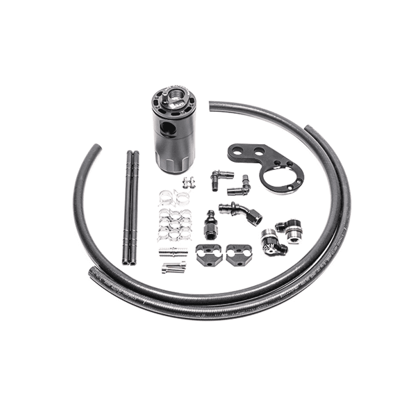 Radium Engineering catch cans feature large 10AN ORB ports, a 4AN ORB drain port, 2-step oil separation baffling, and an O-ring sealed dipstick. This kit mount using factory holes and integrate perfectly with the surrounding components. These two oil catch cans (PCV side and CCV side) function completely independent of each other and are sold individually or together. They do NOT vent to atmosphere (VTA), thus are emissions and track legal. Closed loop systems remove the oil and sludge from the PCV gasses before it is routed to the engine to be burned. A closed loop system also promotes negative crankcase pressure for optimal performance. Furthermore, closed systems prevent unwanted oil vapors from entering the cabin. The dipsticks built into the catch cans allow easy inspection of accumulated fluid. No cutting, drilling or permanent modification to the vehicle is required.