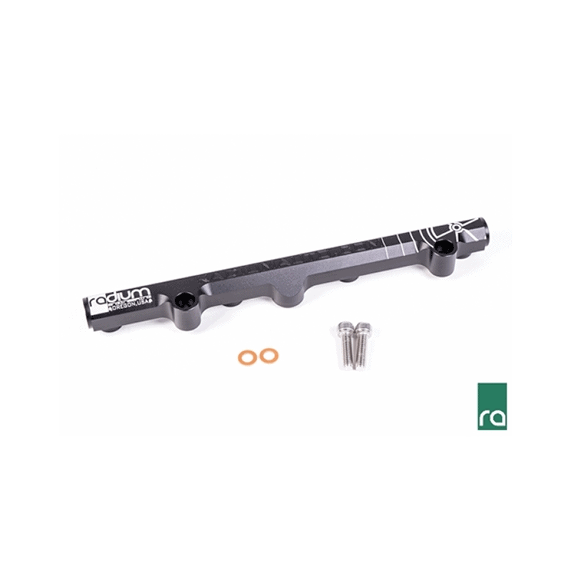 Manufactured with a large 0.69″ internal bore, the fuel rail can support all necessary engine power requirements. They are CNC machined from extruded 6063 aluminum, media blasted, black anodized, and laser etched for a high quality surface finish. Like the OEM fuel rails, the injector bores are 14mm ID so factory injectors are permitted. If purchased after July 2017, there is a provision to reuse the OEM injector clips.